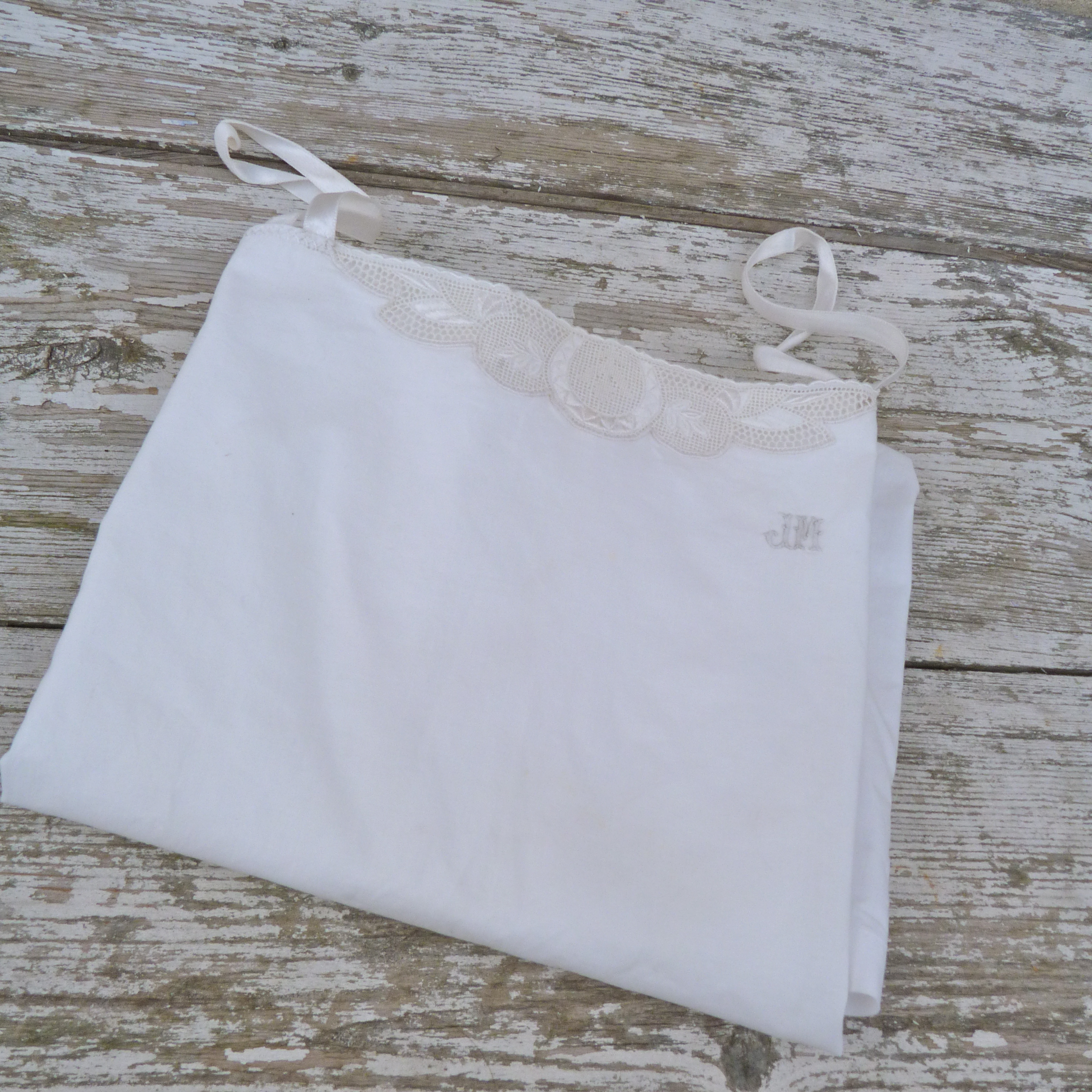A rustic simple white cotton underdress with many flat pleats at the top and a crochet lace around neckline & armholes